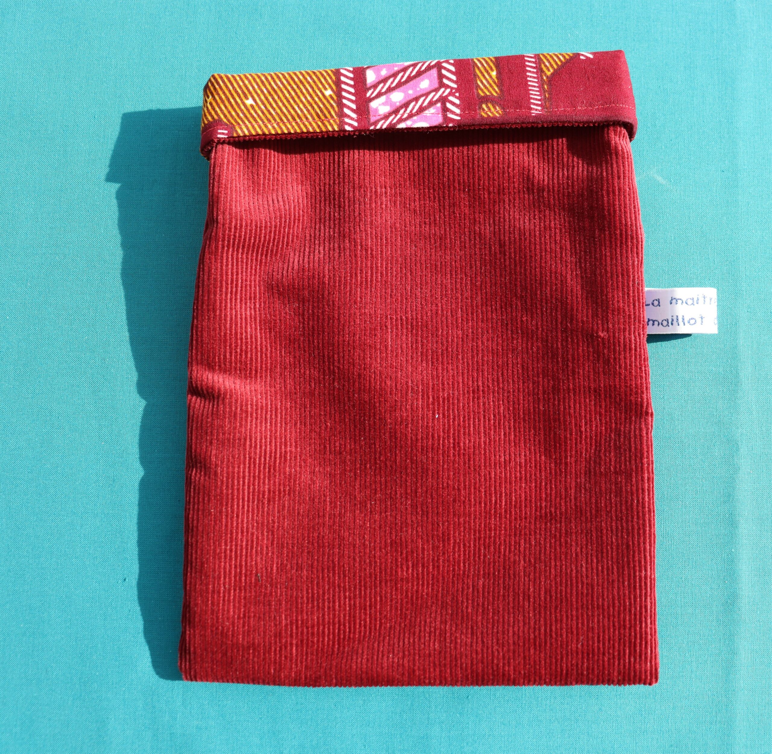 La pochette à livres de poche en velours est cousue dans un joli tissu velours milleraies rouge et est doublé d’un coton imprimé en wax.
